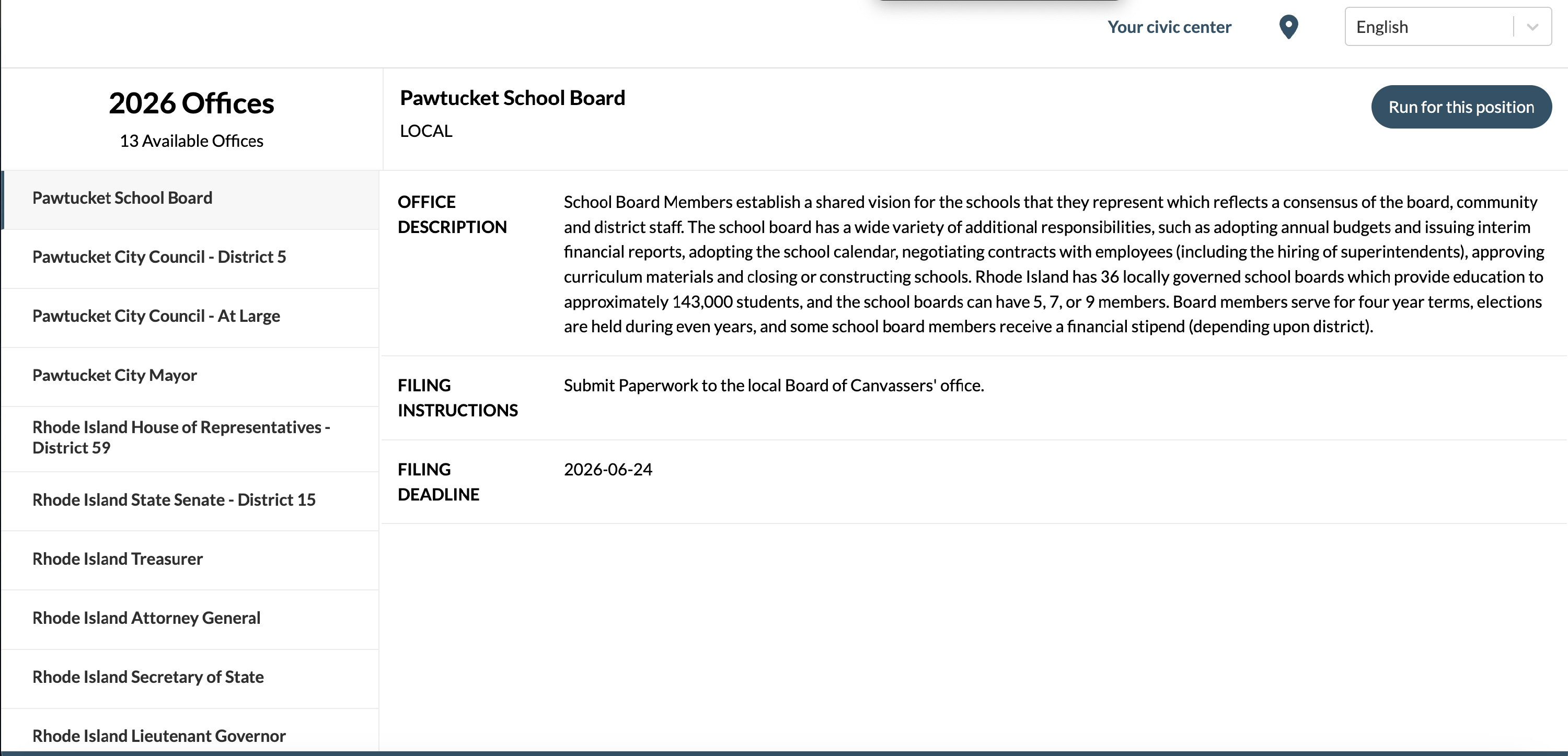 If users are interested in running for a specific position, they can click on “Run for this position” to learn more. A popup appears to let users know more about the process of running for office and provides a list of organizations that help candidates run for office with links to learn more.